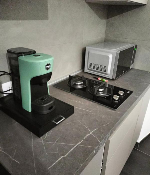 Cucina attrezzata con frigorifero, microonde, stoviglie